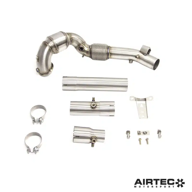 Made from high-quality stainless steel, our sport downpipe with integrated catalytic converter measures 90 mm directly from the turbocharger and gradually narrows to 76 mm after the catalytic converter. This downpipe also features brackets for lambda sensors and a flexible joint for increased durability, as well as an AIRTEC Motorsport decorative badge. The complete kit includes connectors compatible with the original exhaust system, along with an adapter for aftermarket systems, making it the ideal replacement for the original downpipe.